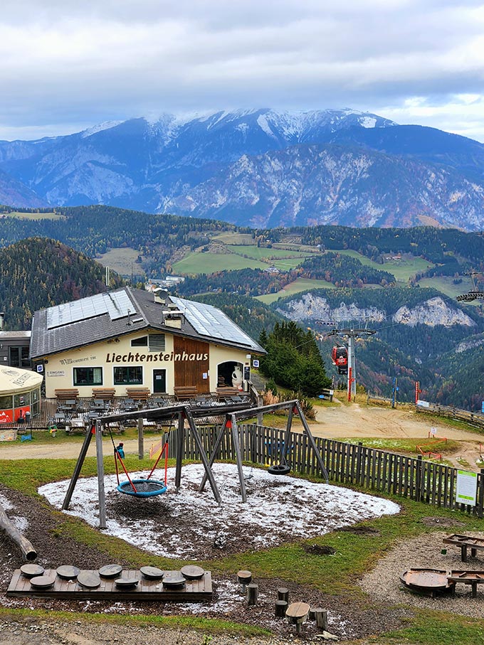 עלינו על הרכבל לפסגת Hirschenkogel, שם ניצב מגדל תצפית גדול מעץ. הקור למעלה היה כל כך חד שהחלטנו לוותר על הטיפוס, ולהסתובב פשוט כדי ליהנות מהנוף. בסמוך יש גם פארק חבלים אתגרי ומסעדה, שהייתה סגורה, ואופציה נוספת היא לרדת את ההר באופני באגי להשכרה – חוויה שמומלץ לקחת בחשבון למי שמגיע עם ילדים או חובבי הרפתקאות.